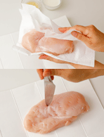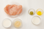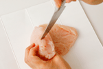 1. 鶏肉は皮をとり、表面の水分をふき、包丁の先で全体に、両面、切り込みを入れる。