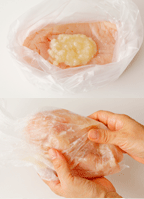 2.湯せんにかけられるポリ袋に入れ、塩麴を全体に揉み込む。