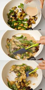 2. 1.にみりんを加えて炒め、なすがふっくらしてきたら、合わせておいたミルク味噌を加え、汁気がなくなるまで炒める。