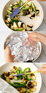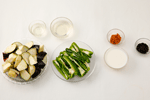 1. フライパンにサラダ油を熱し、なすとピーマンの表面に油をからめ、アルミホイルで落し蓋をし、時々ヘラで混ぜながら、中火から徐々に火力を弱め、3~4分ほどかけて8分通り蒸し焼きにする。