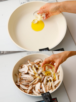 きのこを加え、追加のオリーブ油大さじ1を全体にからめる。