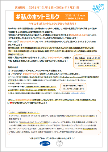 ※ハッシュタグ付きの投稿はJミルクの公式サイトや公式SNS(X、Instagram、Facebook)で取り上げる可能性があります。