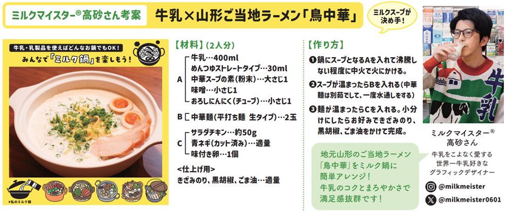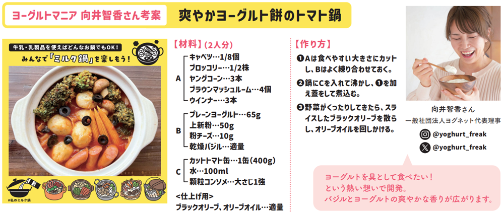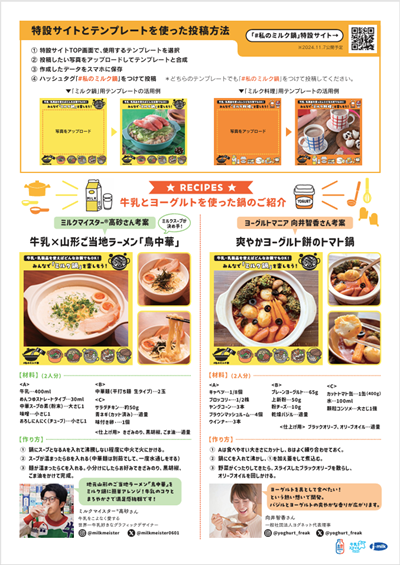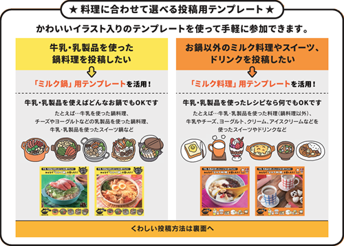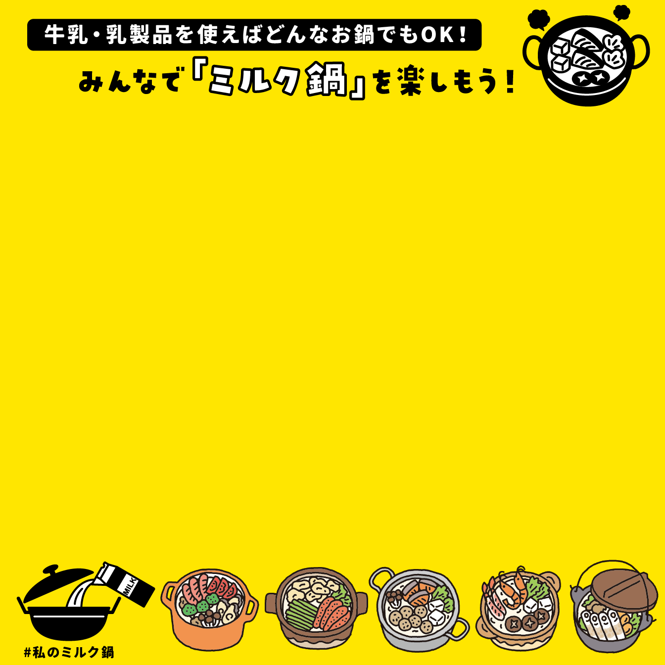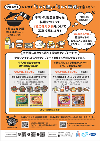 年末年始に牛乳・乳製品をたっぷり使ったミルク鍋を作ってSNS投稿し、牛乳・乳製品を美味しく楽しみながら、消費を増やすことを目指す企画です。今年度は、お鍋以外のミルク料理やスイーツ、ドリンクも投稿可能とし、牛乳だけでなくヨーグルトやチーズなどの乳製品も消費促進します。