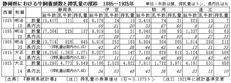 それではここからは、静岡県における導入期の酪農が徐々にステップアップし、搾乳量が1925(大正14)年に国内の7.3%に達するまでの足どりを、畜牛の改良増殖、牛乳営業に係る行政、牛乳飲用の拡がり、煉乳事業の展開、という視点から概観することにします。
