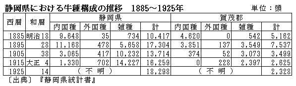 また、外国種と雑種(国内種と外国種の交配種)の合計数(カッコ内は総牛数比)は、1885年は769頭(7%)、1895年には6,136頭(35%)、1905年で10,649頭(78%)、1915年では14,929頭(92%)と急増しており、内国種の激減が明白です。中でも、和牛産地として周辺地域の畜牛生産を牽引して賀茂郡は、その後に総牛数が減少し、1915年には内国種(和牛)が皆無となっており、昔日の面影はありません。