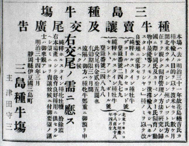 その事業の一端は『牧畜雑誌』に掲載された広告(画像参照)から知ることができます。これは1901(明治34)年3月付の「種牛売譲及交尾広告」であり、広告主は「三島種牛場主津田守三」です。文面には、輸入牛の由来、種牡牛2頭の履歴などを記して「交尾料金弐壱五円」「交尾の需に応ず」とし、「純粋ホルスタイン種牝牡犢余頭」を「望みにより売譲」としています。この三島種牛場は後世に、「その子孫は漸次に改良繁殖されて田方郡の名声を高めたホルスタイン種の基礎になった」などと評価されることになります。