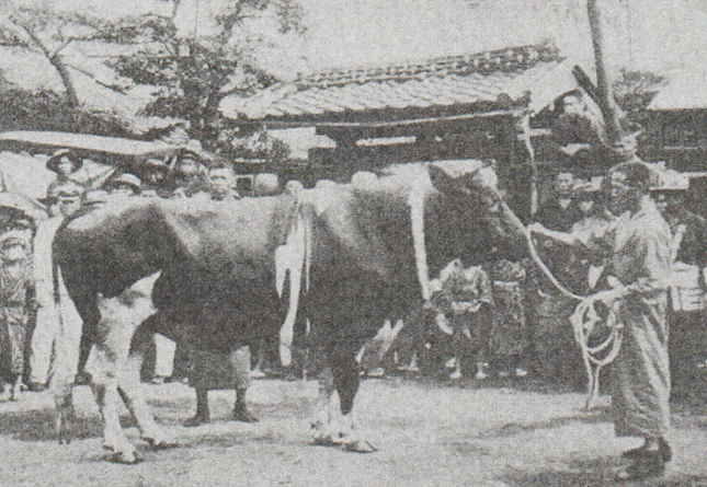 こうした中、1909(明治42)年9月、第1回静岡県産牛共進会が田方郡の三島大社境内にて開催されました。会期は同月24日から3日間、出品頭数は133頭、審査長は叙任辞令を受けた農商務省技師石崎芳吉であり、受賞牛は1等賞2頭、2等賞3頭、3等賞6頭、4等賞44頭となりました。ちなみに、その1等賞(金牌、賞金100円)は「エーアシャー種牡ナイト二世号(田方郡函南村川口秋助)」と「ホルスタイン種牡第一金鵄号(賀茂郡産牛組合長渡辺要)」でした。