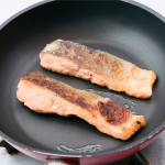 フライパンにサラダ油(大さじ1/2)を入れ、鮭にこしょう(少々)をし、小麦粉(大さじ1)をつけ、両面しっかりと焼いて、器に盛りつける。