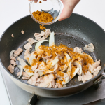 深型フライパンにサラダ油を入れ熱し、豚肉を炒め、色がかわったら玉ねぎを入れ炒め、カレー粉を入れ弱火で炒める。(辛いのがお好きな方はお好みで一味唐辛子を加えても)