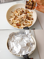 3. 栗を加え、アルミホイルで落し蓋をし、時々全体を混ぜながら、中火で2~3分かけて焦げ目をつけるように炒める。