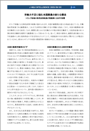 トランプ政権による移民政策の転換が進められる中、米国の酪農業は重大な局面を迎えている。労働集約型産業である酪農業は、これまでも深刻な労働力不足の問題に直面してきた。米国の酪農場は移民労働者に大きく依存しており、酪農生産における労働力の半数が移民労働者で、生乳供給量の約8割は移民労働者を雇用する酪農場によって担われている。従って、移民の排除は、酪農生産を縮小させ、牛乳価格の上昇と食料供給の不安定性をもたらすことで、米国経済の大きな損失に繋がることが懸念されている。欧米のメディアや米国の農業団体の情報を中心に、状況を追った。