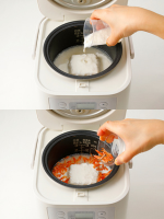 2. 内釜に米、分量の水、スープの素を加えてひと混ぜする。